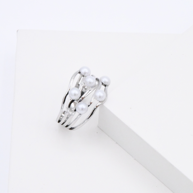 Bague 4 range avec perles blanche réglable en acier inoxydable.