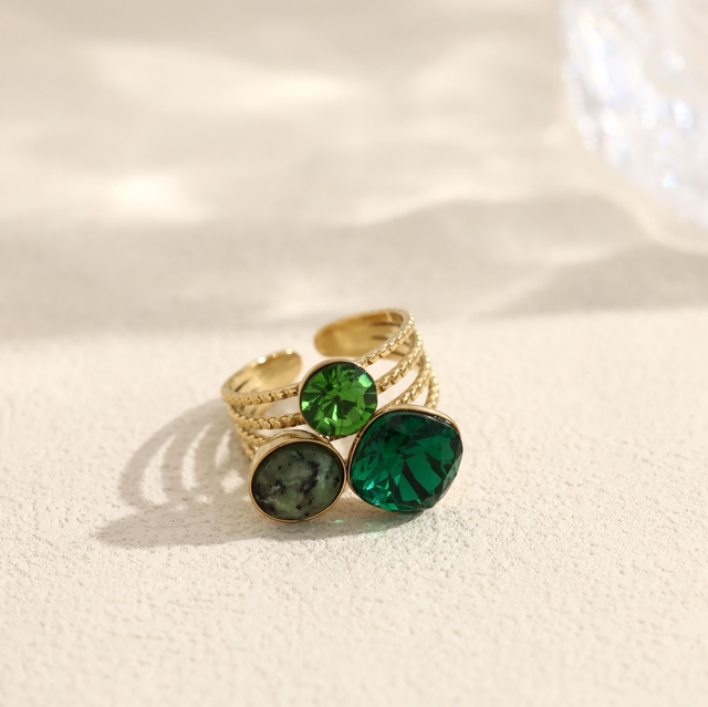 Bague triple pierre dont une pierre véritable en acier inoxydable doré.