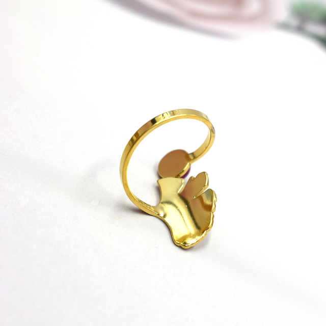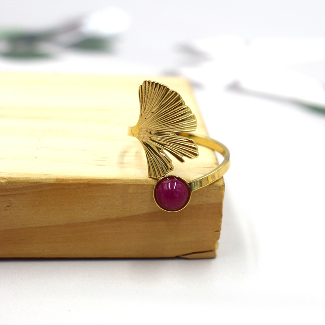 Bague fleur de ginkgo avec sa pierre réglable en acier inoxydable doré.