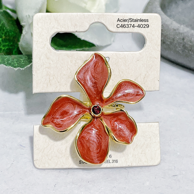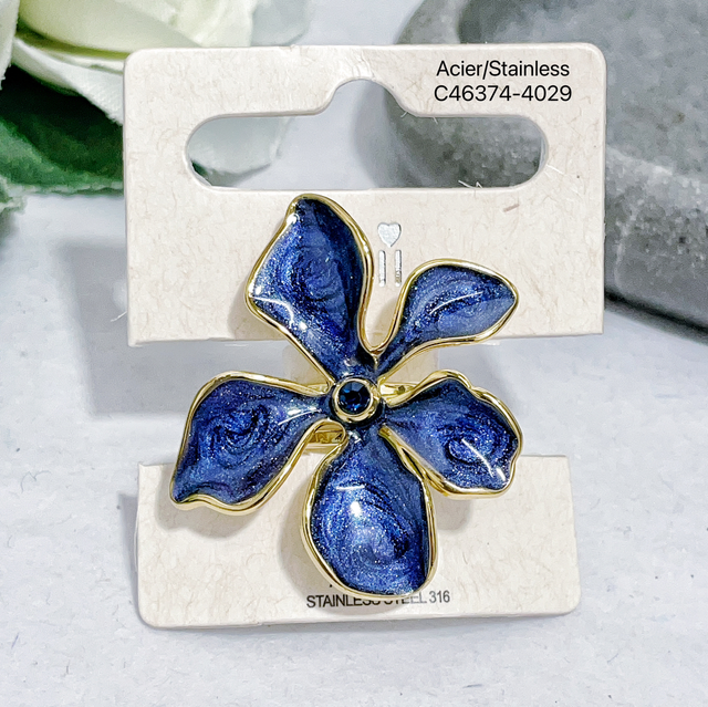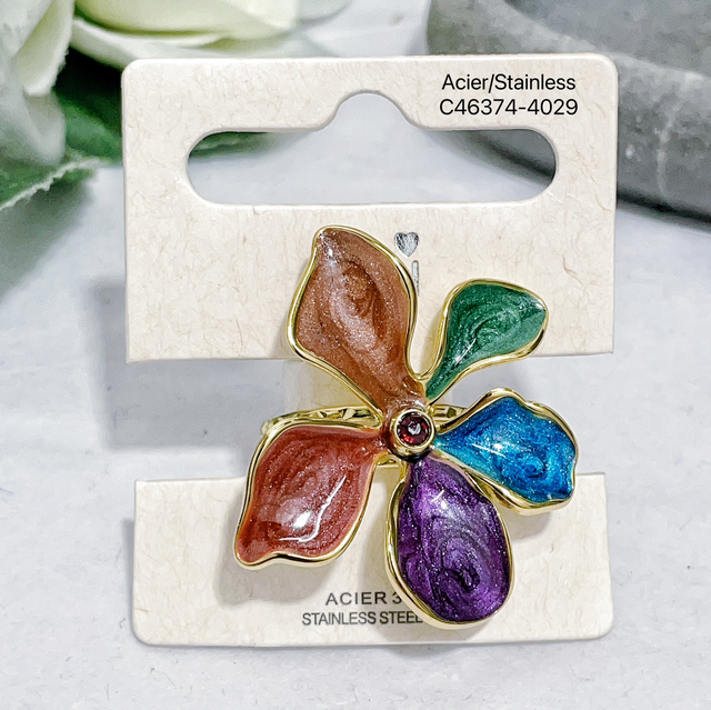 Bague fleur émaillée Pailleté avec strass central en acier inoxydable doré.