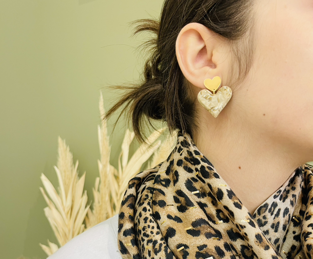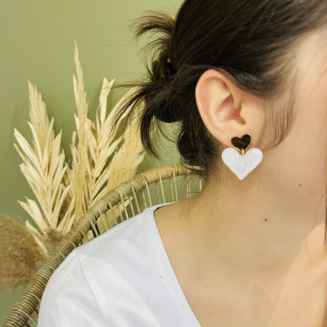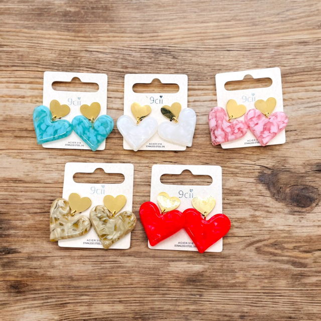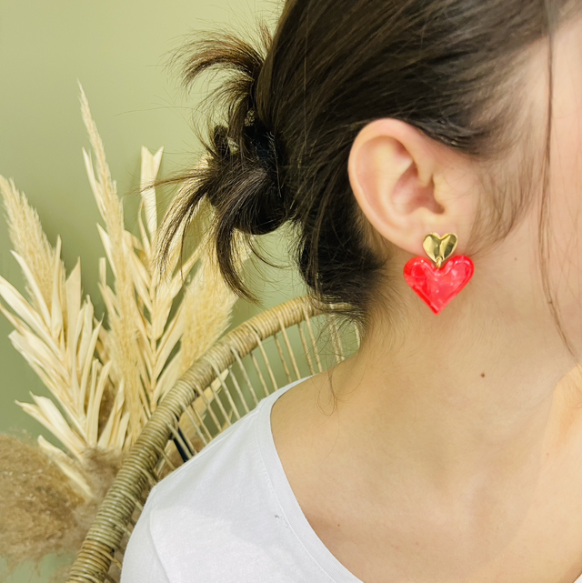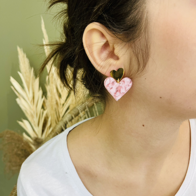 Boucle d’oreille cœur en résine et acier inoxydable doré.