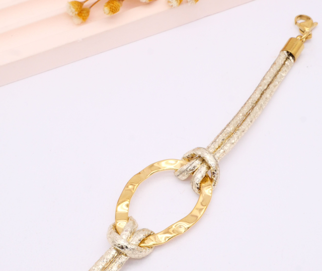 Bracelet doré à anneau central, cordons tressés effet cuir et chaînette réglable. Moderne, lumineux et élégant, il apporte une touche chic à toutes tes tenues.