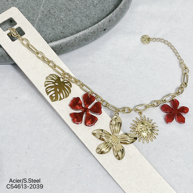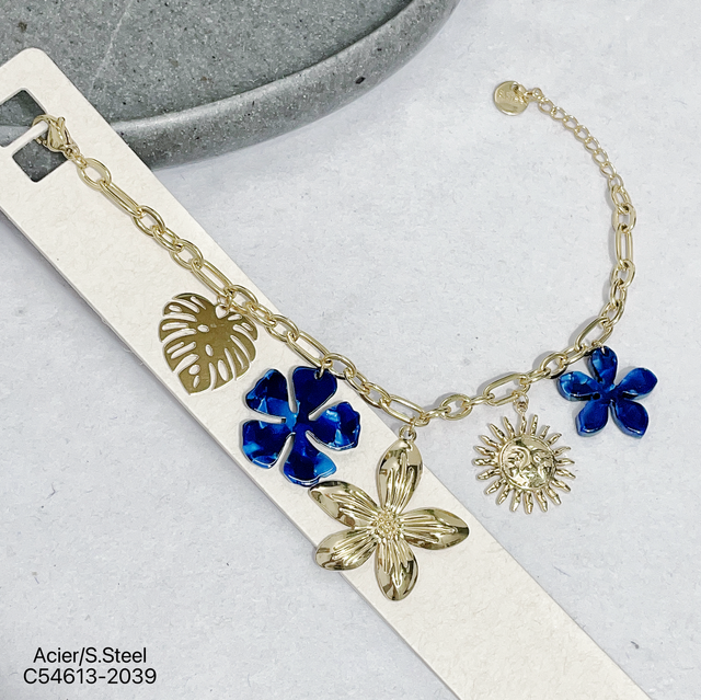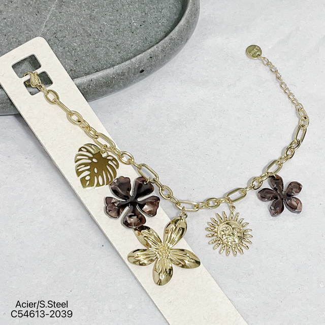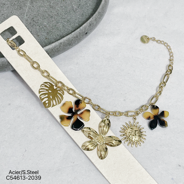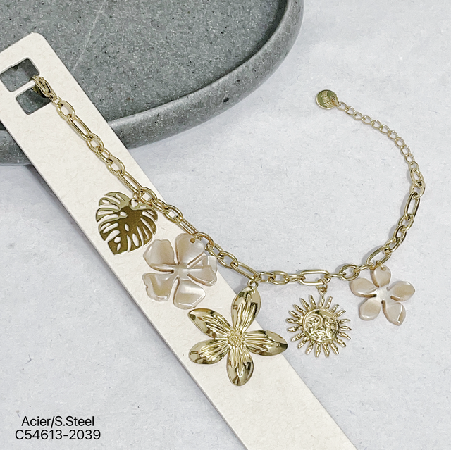 Bracelet maille avec charms en résine nacré et en acier inoxydable doré.