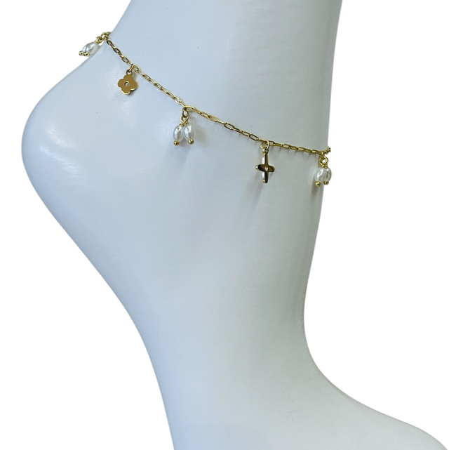 Chaîne de cheville avec perle et pampille en acier inoxydable doré.