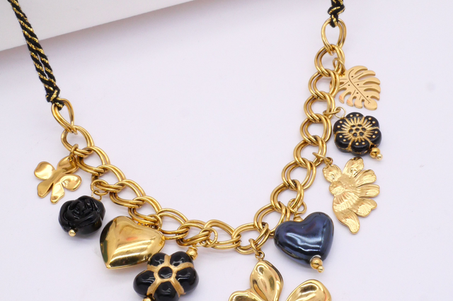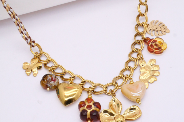 Ce collier tendance associe une chaîne dorée rehaussée d’un cordon tressé à une sélection de pendentifs raffinés et coloré assortie. Son style bohème-chic en fait un accessoire parfait pour apporter une touche solaire et originale à vos tenues, de jour comme de nuit.