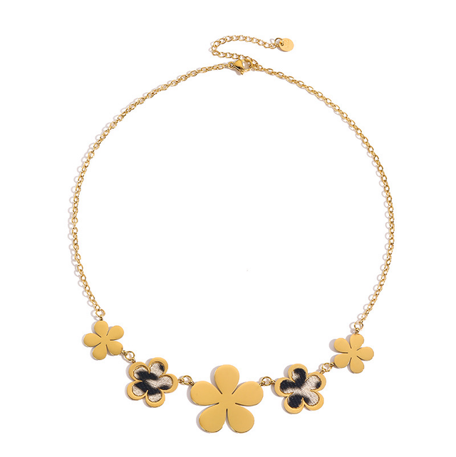 Magnifique collier fleur léopard beige en acier inoxydable doré.
