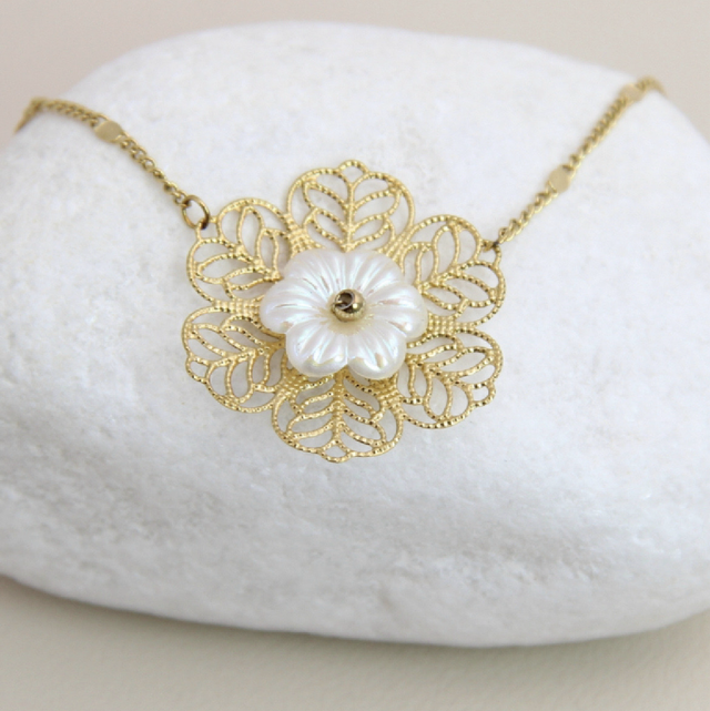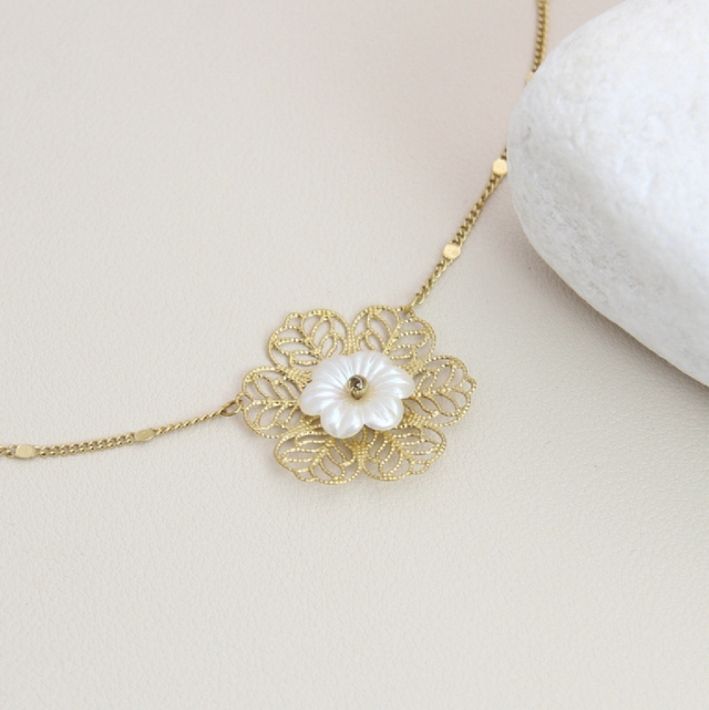 Collier fleur orné de nacre en acier inoxydable dorée.