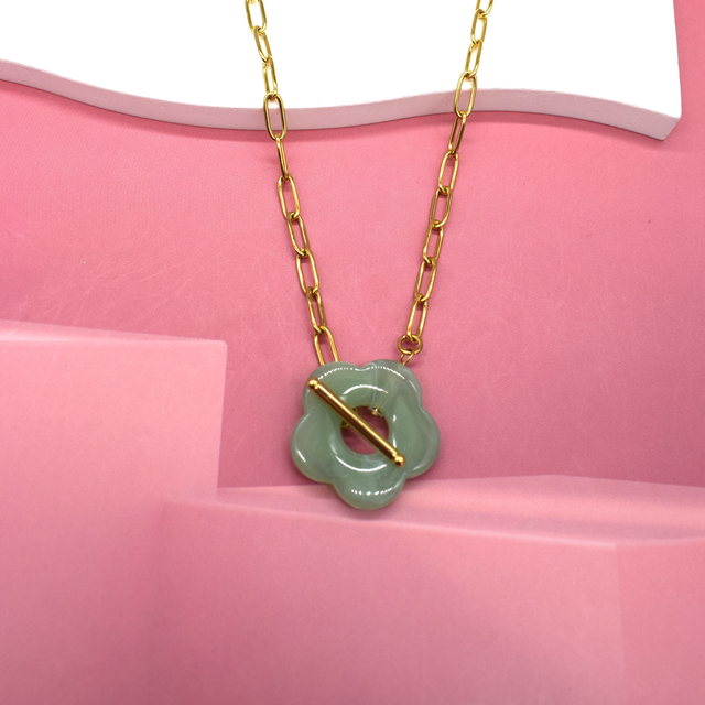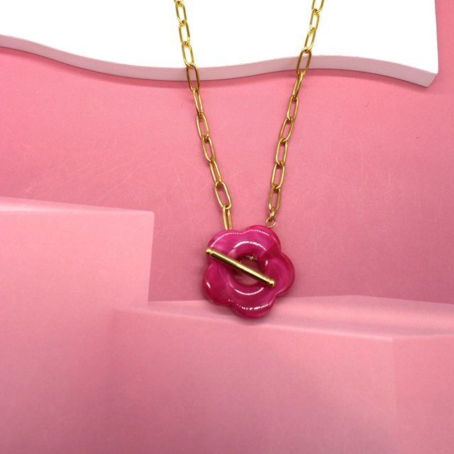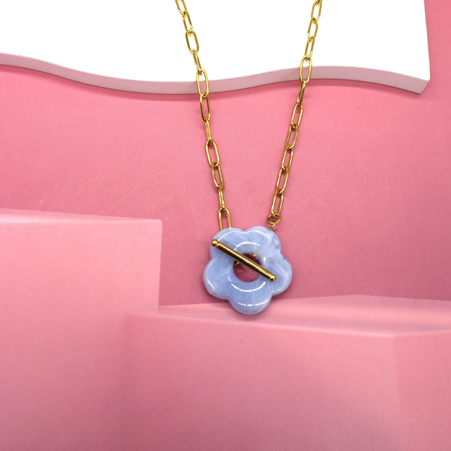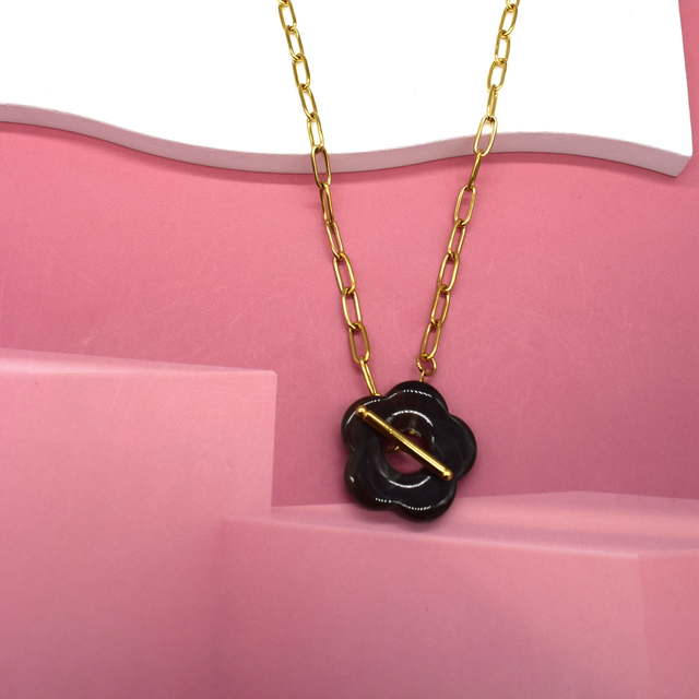 Collier maille en acier inoxydable doré avec fleur en résine fermoir en T.