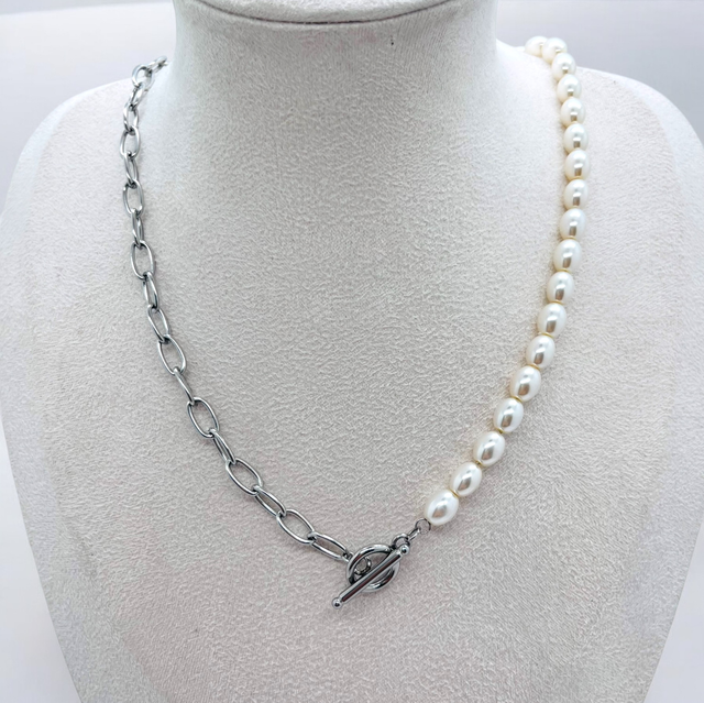 Collier perle et maille en acier inoxydable avec fermoir en T.