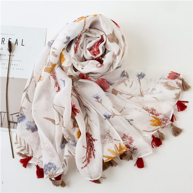 Foulard Impeimé fleurs avec mini sequins et pompons.