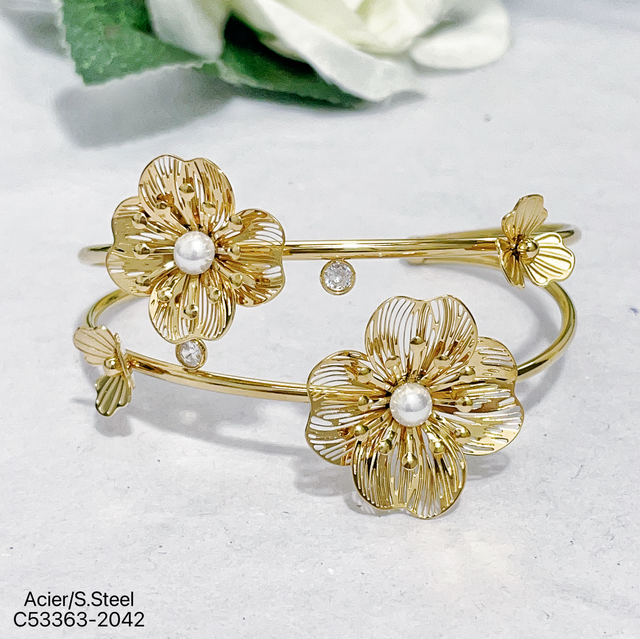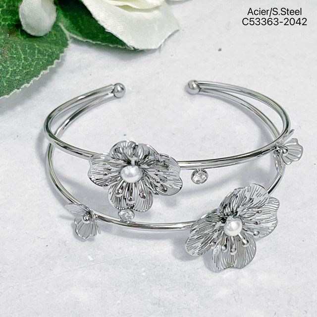 Jonc d’où le avec fleur ornée de perle et strass en acier inoxydable.