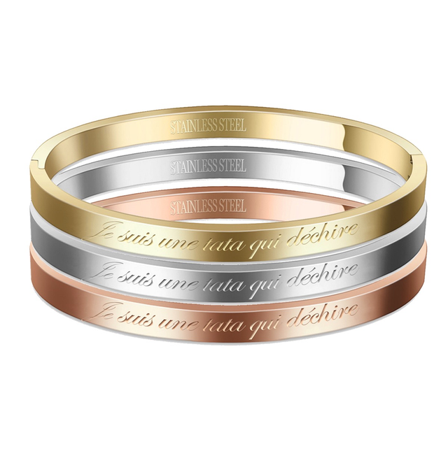 Jonc message graver JE SUIS UNE TATA QUI DÉCHIRE en acier inoxydable.