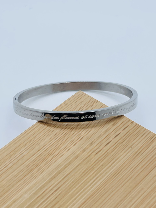 Jonc message "Laisse tomber les fleurs et sert moi un mojito” écris en italique en acier inoxydable.