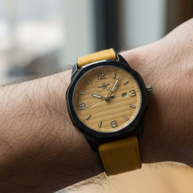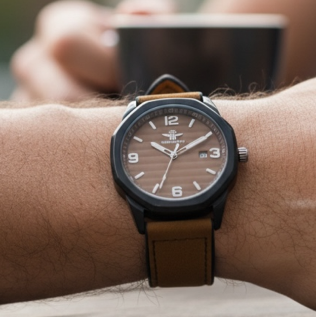 Montre Michael John, bracelet caoutchouc avec un revêtement simili cuir avec un fermoir aimanté.