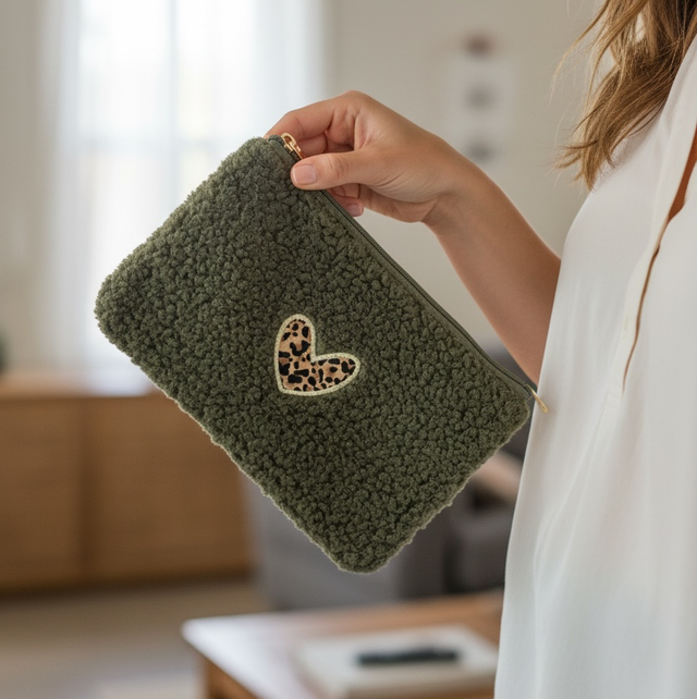 Pochette coeur léopard -tissu moumoute