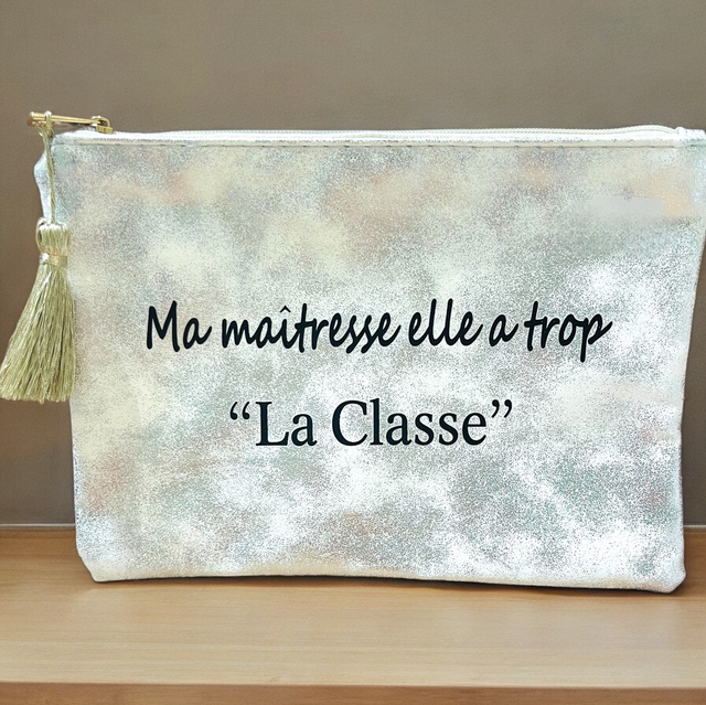 Pochette argenté irisé avec message " MA MAÎTRESSE ELLE TROP LA CLASSE".