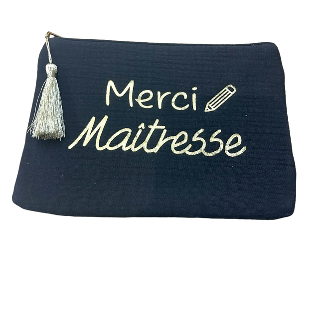 Pochette Merci Maîtresse en gaze de coton avec pompon.